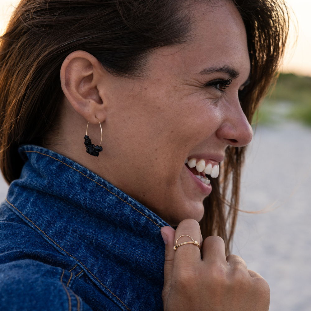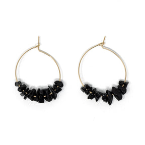 Introducing our new Chip Bead Black Tourmaline Hoops! These simple and stylish earrings are made with gold filled wire strung with raw stone chip beads. Wear this root chakra for grounding, vitality, practicality, & solidarity.